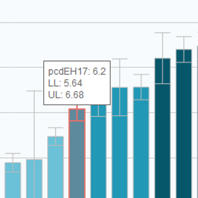 By default, if you wish to show confidence limits in the Bar Chart component, you will need to add two columns  called ‘ll’ and ‘ul’ to your workbook for any indicators you wish to show confidence limits for (see ‘Entering Associate Values’ in sub-section ‘The Datasheets’ of The InstantAtlas Excel Data Manager). However if you have associate columns with different names that you wish to use for the error bars, you can specify these by entereing their names into the ‘Upper Limit Data’ and ‘Lower Limit Data’ properties.